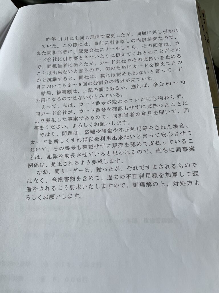 4、遵法精神の低い社員らにより、継続された、カード再発行と不正利用‼️再発防止には法令遵守を社員らに喚起すべきだ。